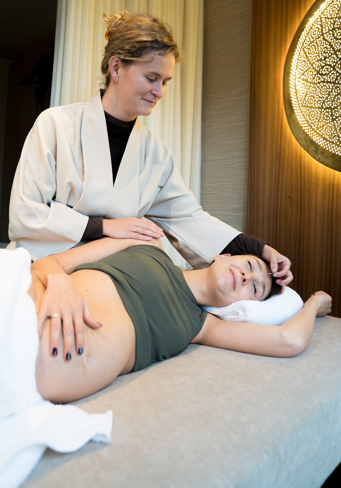 Draag iets waar jij je prettig in voelt. Als het nodig is om bepaalde kledingstukken uit te doen, gebeurt dat altijd in privacy en krijg je de mogelijkheid om je goed te bedekken. Jouw comfort en ontspanning staan tijdens de behandeling voorop.