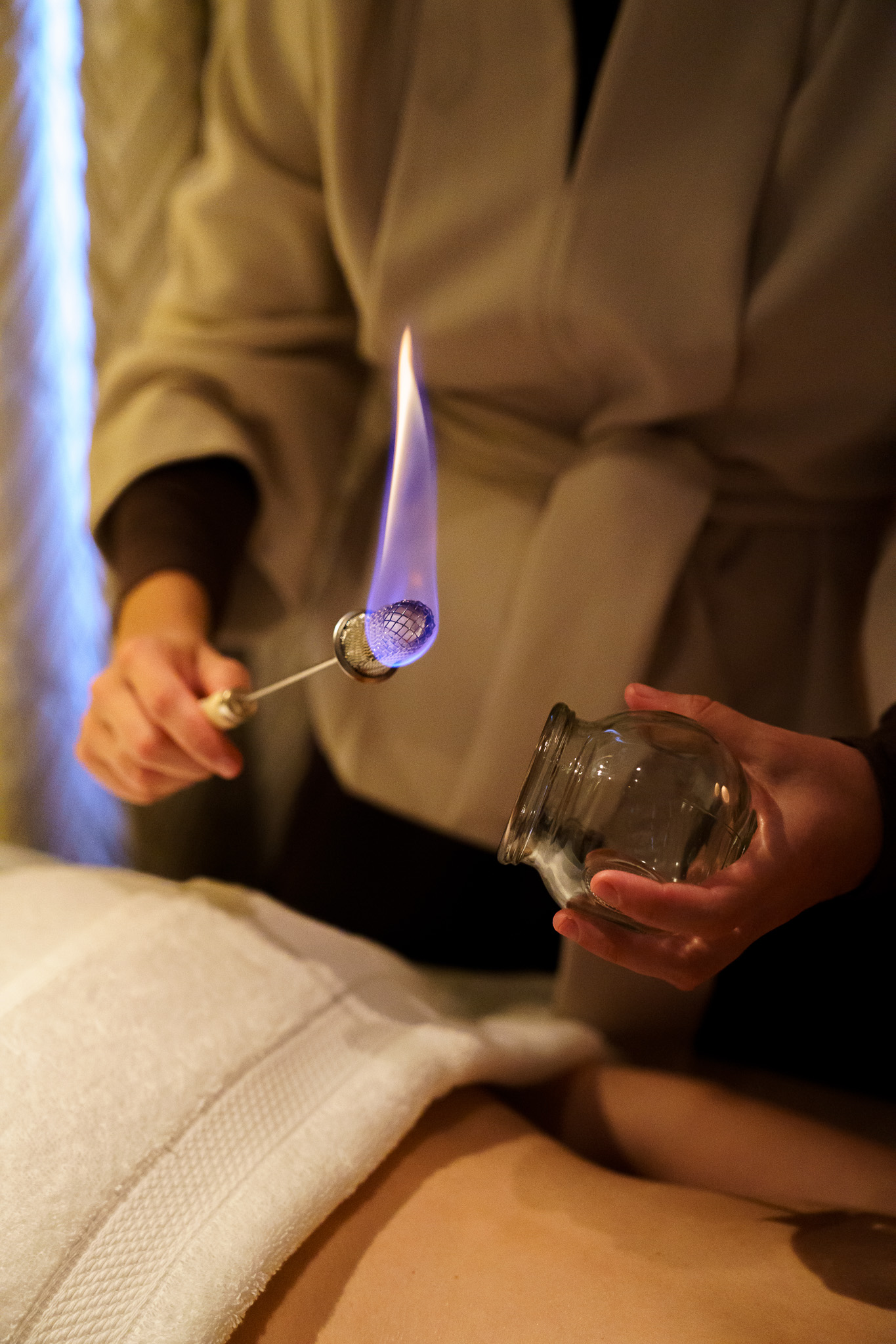 We place cups on the skin to stimulate blood flow and release tension with a gentle vacuum effect. The cups usually stay in place for a few minutes.