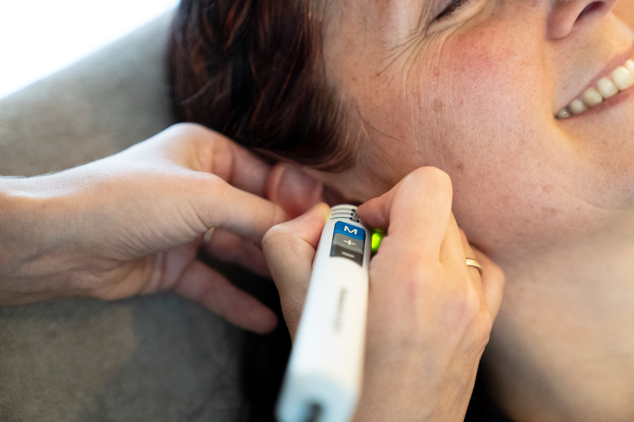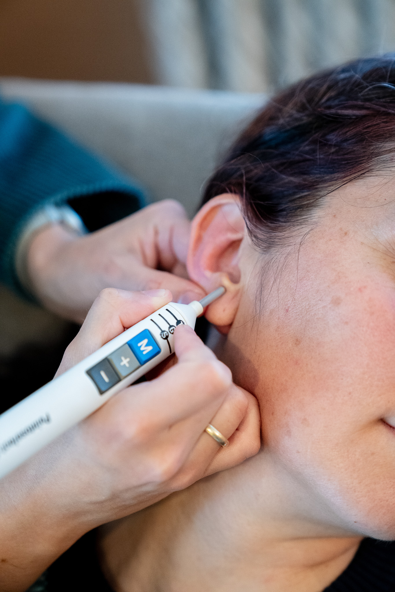 Brief intake, mapping of ear points, placement of tiny indwelling retention needles or ear seeds (remain a few days).